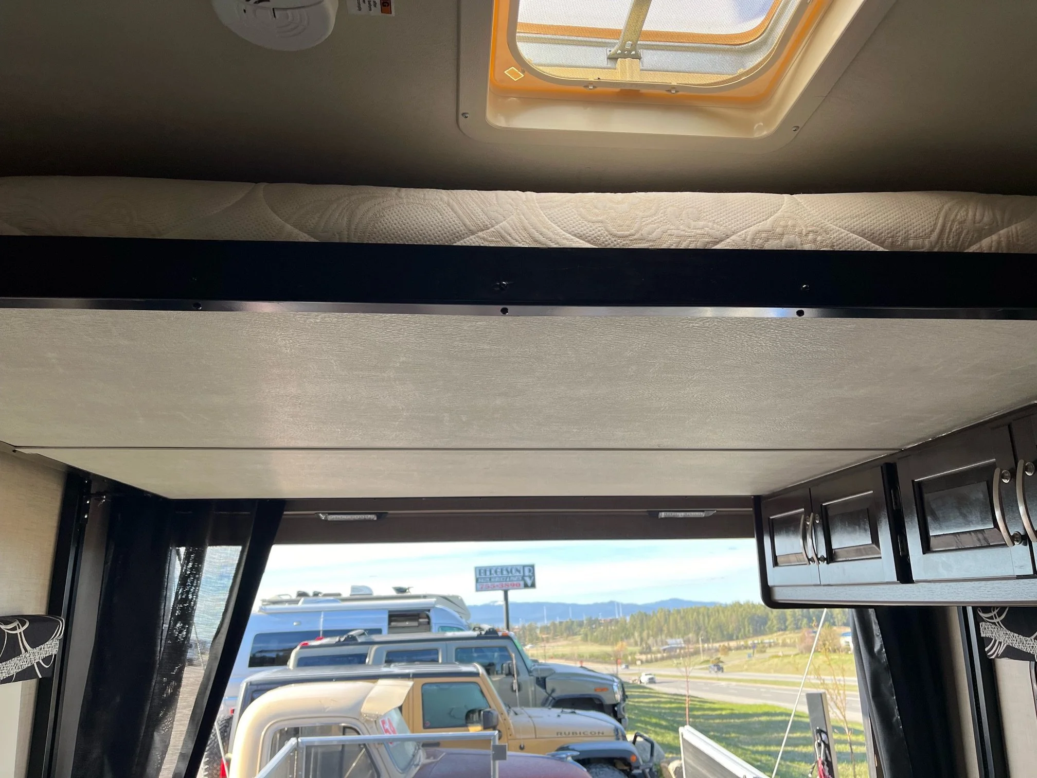 Toy hauling space is also a sleeping area. Bed lifts and stores at ceiling height.
