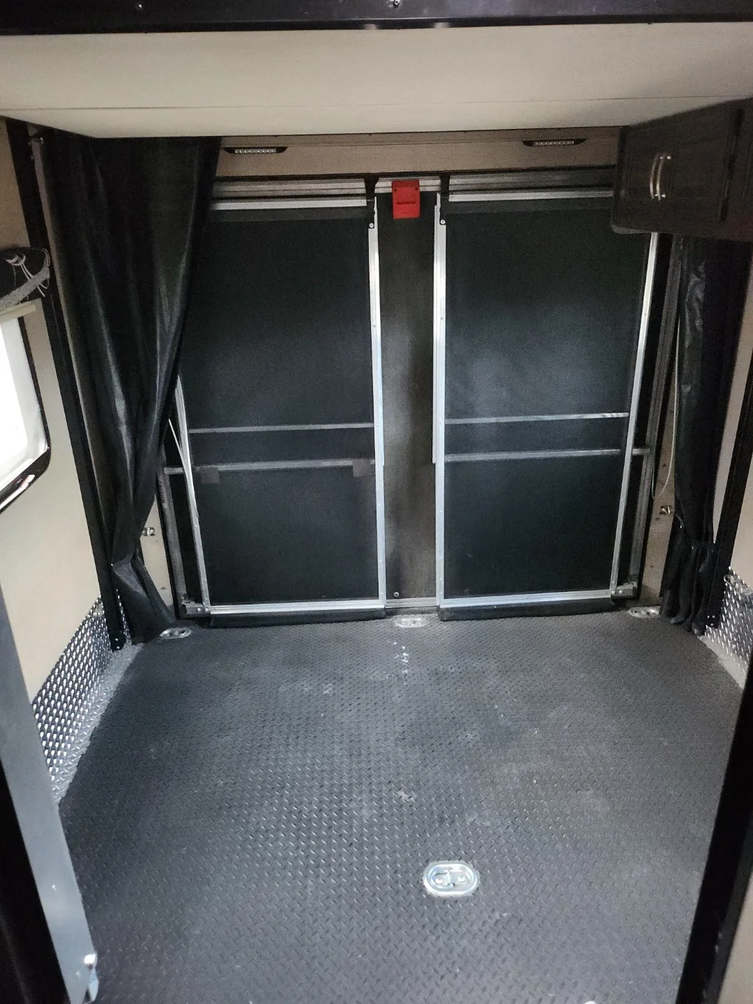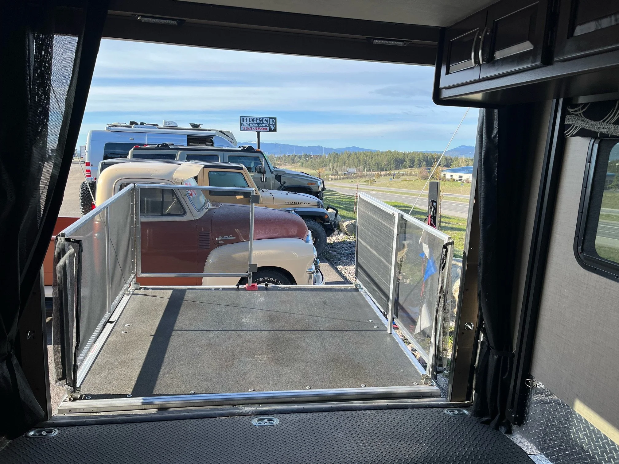 Toy hauling space also converts to a great usable indoor / outdoor patio space with railing and screens.