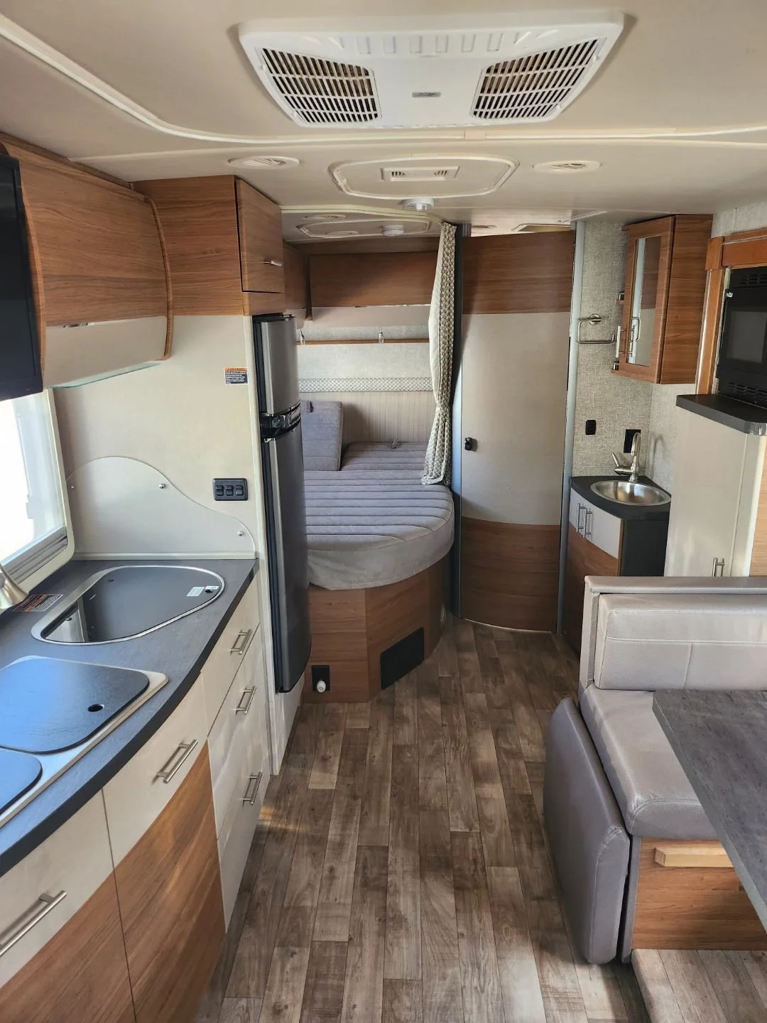 For those who find joy in culinary endeavors, the full kitchen in this Class B+ motorhome is a dream come true. Equipped with all the necessary appliances, including a stove, oven, refrigerator, and microwave, preparing scrumptious meals on the road has never been easier. You'll have everything within reach to whip up your favorite dishes and create lasting memories around the dining table.
